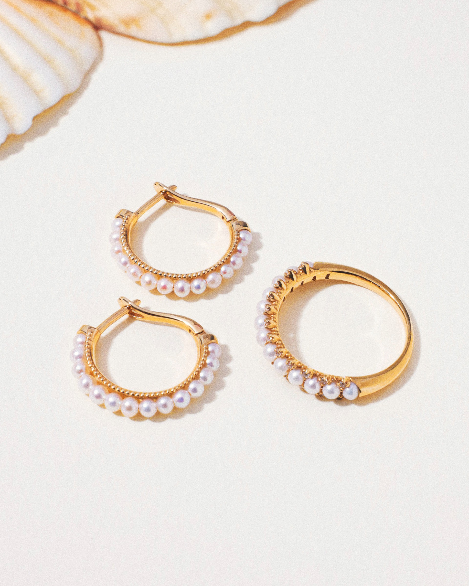 A set of earrings and ring with intricately set natural pearls